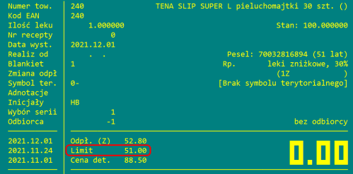 Podczas ekspedycji program automatycznie obliczy limit dla całego opakowania środka pomocniczego mnożąc limit za jedną sztukę przez wielkość opakowania lekospisowego.