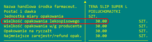 W przypadku, gdyby w polu Wielkość opakowania lekospisowego było wprowadzone 1 OP, program podczas ekspedycji tego środka zastosowałby limit refundacji całego opakowania 30 sztuk w wysokości 1,70 zł.