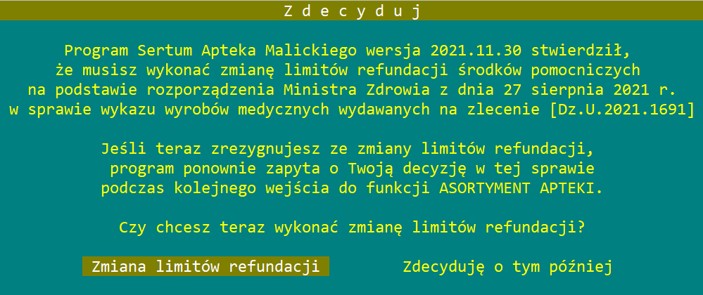 W Asortymencie dodano funkcję jednorazowej, automatycznej zmiany limitów refundacji środków pomocniczych o dotychczasowych kodach P100 i P101. Pieluchomajtki o nowym kodzie P100-PL otrzymają limit refundacji 1,70 zł za sztukę, a wkłady anatomiczne i podkłady o nowym kodzie P100-WK otrzymają limit refundacji 1,00 zł za sztukę. Funkcja wykona się automatycznie podczas pierwszego uruchomienia modułu Słowniki > Asortyment apteki.