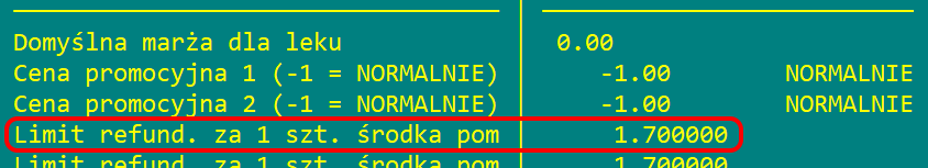 Na przykład dla środka pomocniczego o kodzie P100-PL posiadającego limit refundacji 1,70 zł oraz opakowanie 30 szt program obliczy limit refundacji całego opakowania w następujący sposób: