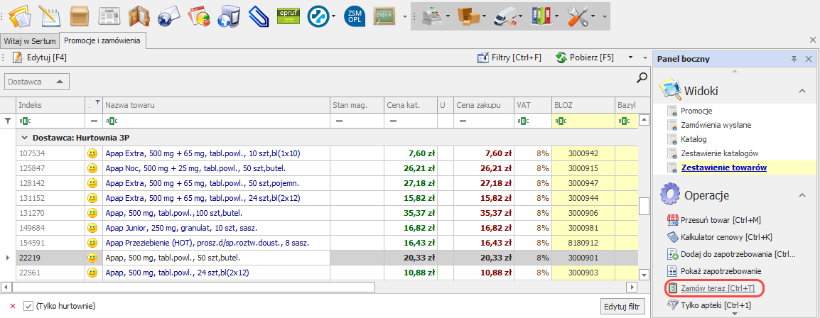 - Zmodyfikowaliśmy działanie blokady wysyłki zamówień do hurtowni (ustawiana w Sertum np.: w przypadku inwentaryzacji) wysyłanych za pomocą operacji Zamów teraz. Zamówienie nie zostanie wysłane nawet w przypadku, gdy użytkownik rozpoczął jego tworzenie przed ustawieniem blokady.