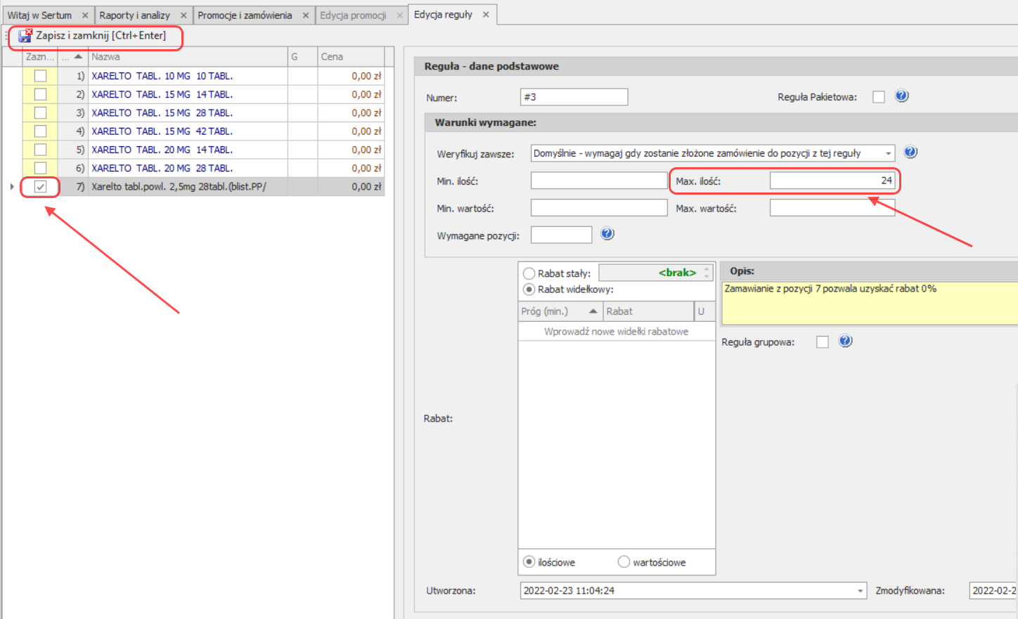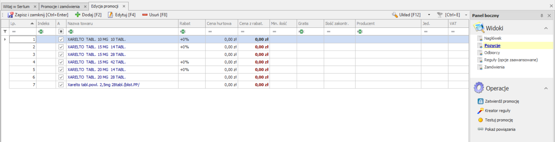 Każda z pozycji będzie automatycznie posiadała ustawioną Cena z rabat. 0,00 zł oraz rabat 0%. W przypadku promocji przygotowanej pod Xarelto, prosimy Pamiętać aby cena na ten preparat była atrakcyjniejsza niż cena w hurtowni. Najbezpieczniej było by zostawić cenę na poziomie 0,00 zł, wtedy będzie pewność, że program zawsze wskaże zamówienie tej pozycji w pierwszej kolejności z dostępnej promocji.