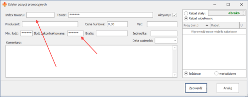 Pojawi się wtedy okno Edytor pozycji promocyjnych, gdzie wpisując w pola nadpiszemy zmiany dla wszystkich zaznaczonych wcześniej pozycji:
