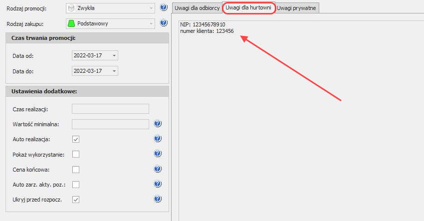 Jeżeli chcemy do zamówienia nanieść dodatkowe informacje, np.: numer NIP, czy numer klienta, możemy to zrobić w zakładce „Uwagi do hurtowni„, wtedy informacja ta zostanie umieszczona w mailu.