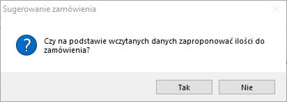 Po kliknięciu przycisku TAK w tabeli pojawią się dwie nowe kolumny, uzupełnione danymi o sprzedaży i stanach magazynowych z zadanego okresu poszczególnych towarów znajdujących się w ofercie promocyjnej. Dodatkowo zostaną zaproponowane ilości do zamówienia (zostaną wypełnione pola w kolumnie Zamów). Po kliknięciu przycisku NIE od razu kolumny dotyczące sprzedaży i stanów magazynowych zostaną uzupełnione, lecz nie zostaną zaproponowane ilości do zamówienia.