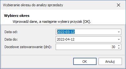 Domyślny okres analizy to miesiąc wstecz od dnia bieżącego, a domyślny okres zatowarowania to 30 dni. Po wprowadzeniu właściwych dat oraz ilości dni zatowarowania należy kliknąć przycisk OK.