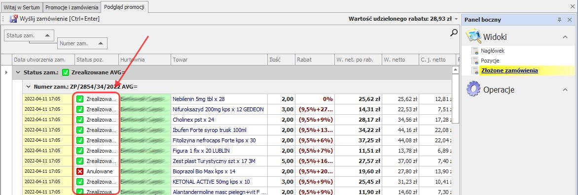 Widok zawiera wysłane zamówienia oraz status ich realizacji.