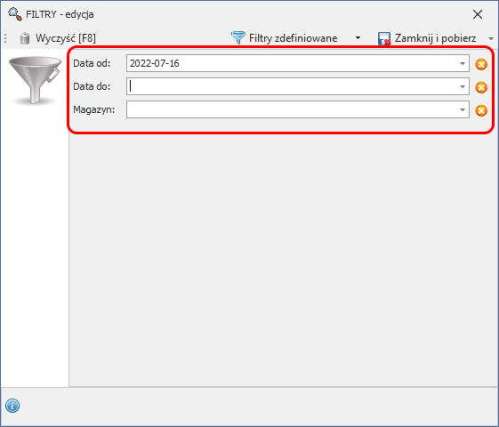 Następnie uzupełnić filtry Data Od: oraz Data Do: i wskazać wybrany magazyn lub magazyny. Uwaga domyślnie raport filtr Data Od: ustawia się na miesiąc wstecz.