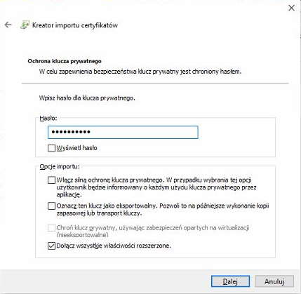 wpisujemy hasło użyte w czasie generowania certyfikatu i klikamy „Dalej”
