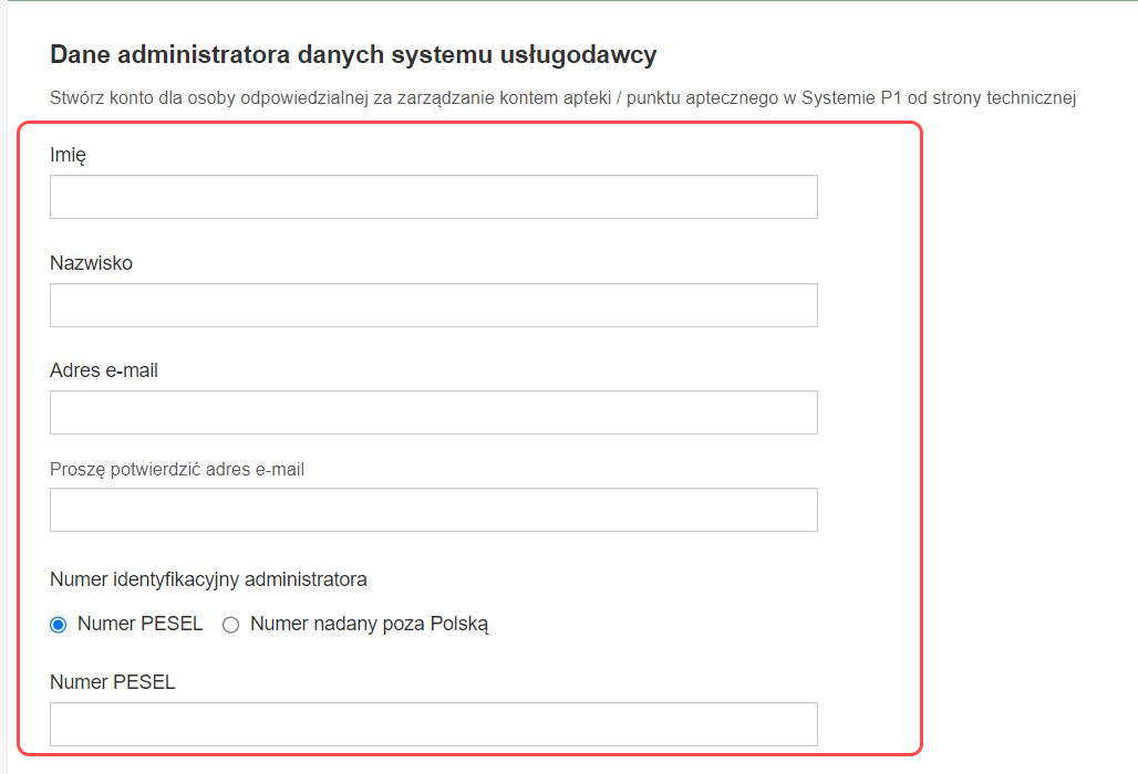W kolejnej części formularza wypełniamy Dane administratora danych systemu usługodawcy, czyli dane kierownika wprowadzone wcześniej. Dodatkowo należy wpisać numer PESEL.