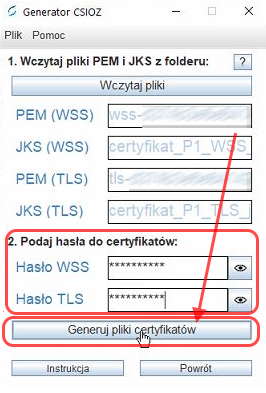 W tym miejscu należy wpisać wcześniej utworzone hasła dla certyfikatów WSS i TLS.