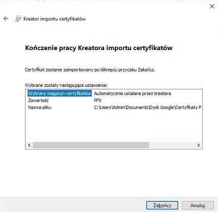zostawiamy domyślną opcję (Dołącz wszystkie właściwości rozszerzone) klikamy znów „Dalej”, następnie wybieramy „Zakończ”. Na zakończenie instalacji powinno pojawić się okno Kończenie pracy Kreatora importu cerfyfikatów.