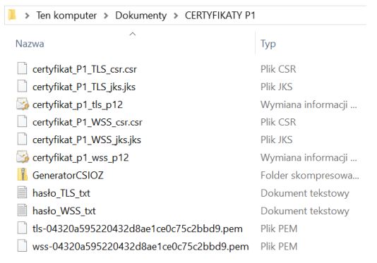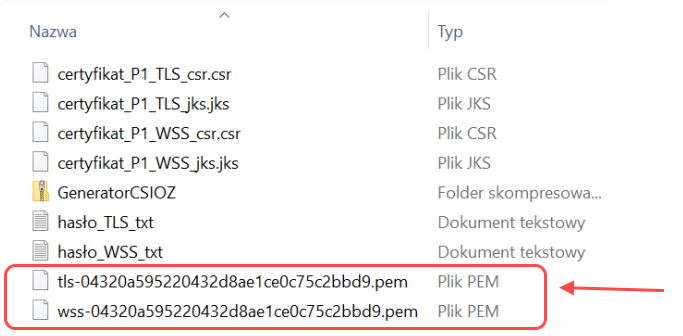 Pliki certyfikatów (PEM – TLS i WSS) należy pobrać poprzez otwarcie załączonych w wiadomości linków i zapisać w folderze z poprzednimi certyfikatami i generatorem, jak prezentuje to obraz poniżej: