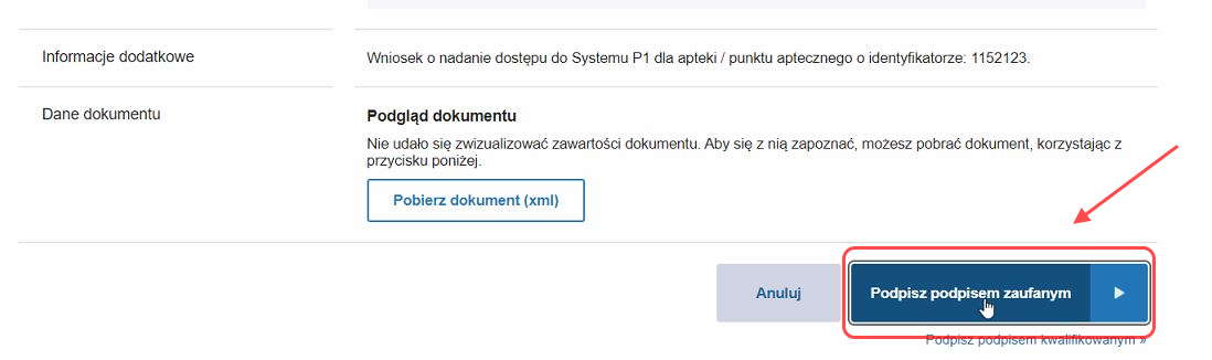 Całość wniosku potwierdzamy przyciskiem . Aby zakończyć proces składania wniosku musimy go tylko podpisać profilem zaufanym kierownika apteki.
