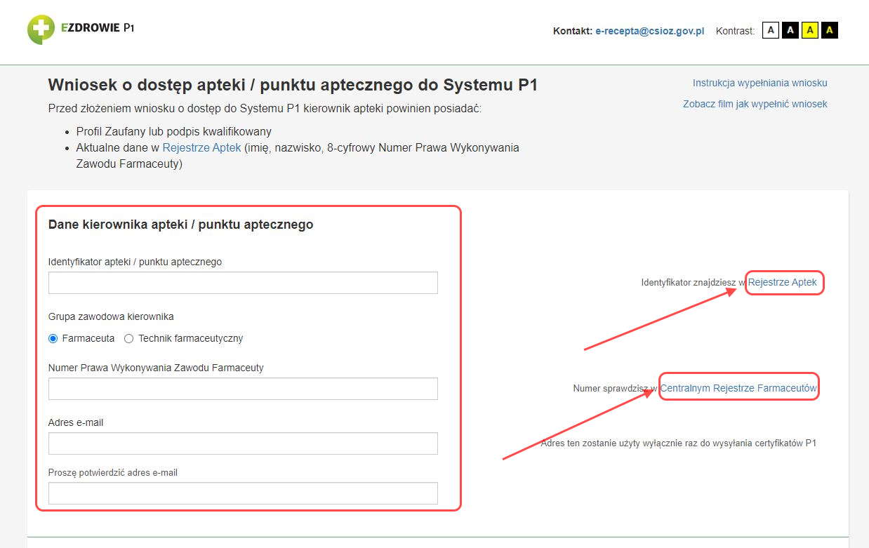 Jeżeli nie pamiętają Państwo danych, w tym celu po prawej stronie okna znajdują się odnośniki do Rejestru Aptek oraz Centralnego Rejestru Farmaceutów.