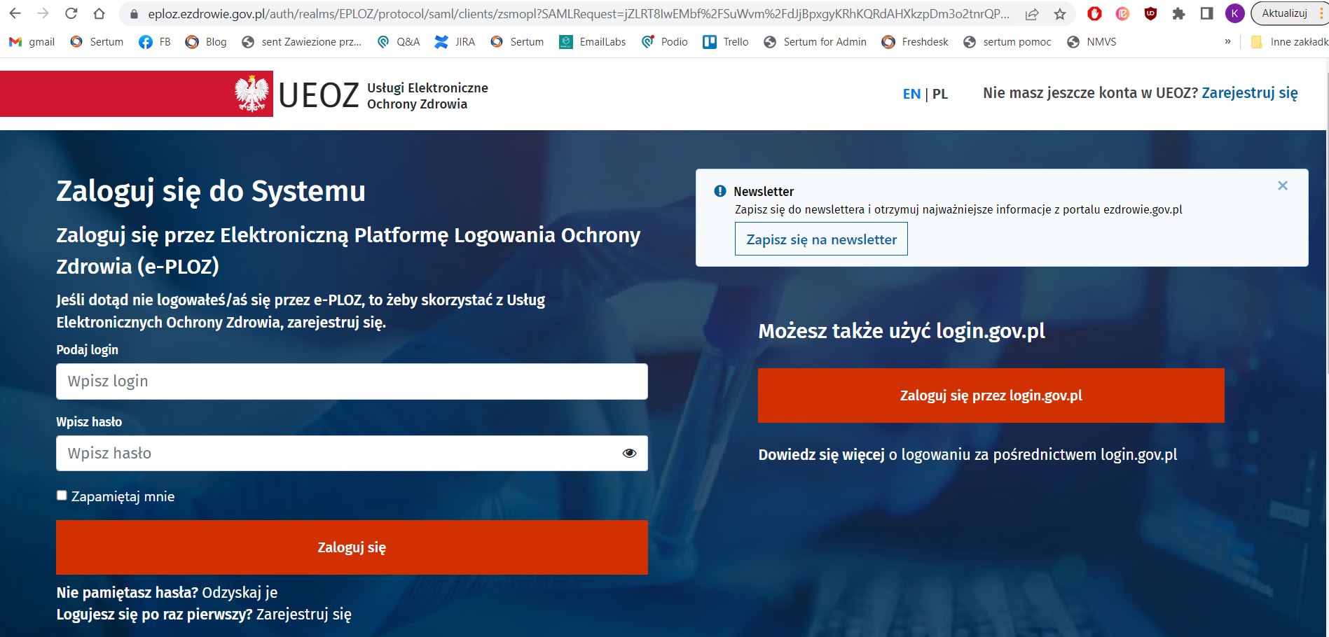 Aby to zrobić wchodzimy na stronę: https://zsmopl.ezdrowie.gov.pl/ a następnie Klikamy na zaloguj. Zostaniemy przeniesieni na stronę: Elektroniczna Platforma Logowania Ochrony Zdrowia.