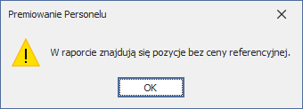 - W raporcie Premiowanie personelu, przed wyświetleniem wyników weryfikujemy, czy znajdują się w nim towary bez ceny referencyjnej