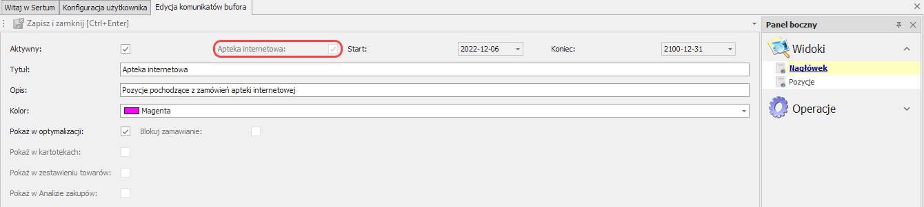 - Komunikaty dla apteki internetowej widoczne są tylko w buforze zamówień