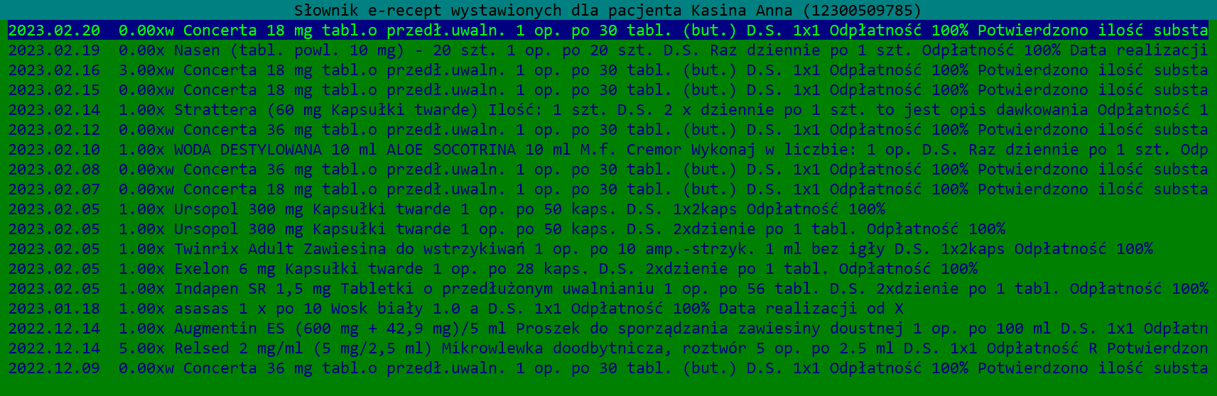 Do Słownika e-recept wystawionych dla pacjenta (dostępnego po wprowadzeniu PP w polu Kod EAN) dodano funkcjonalność podglądu zawartości wybranej e-recepty oraz jej realizacji. Podgląd uzyskuje się za pomocą klawisza funkcyjnego F1. Funkcjonalność pozwala na przejrzenie zawartości recept całkowicie zrealizowanych.