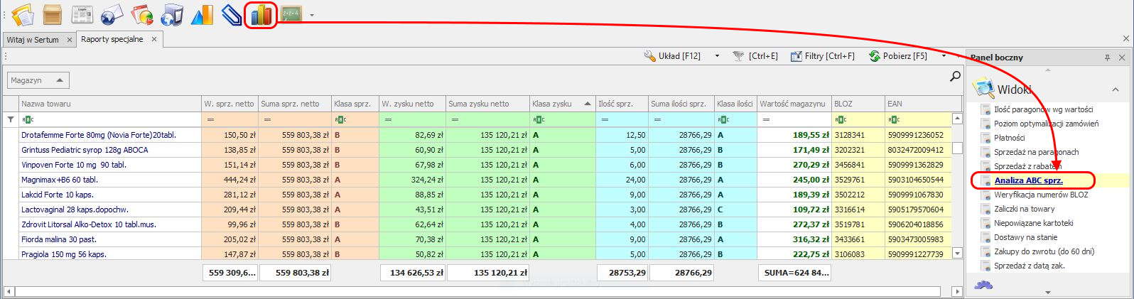 W ramach raportów specjalnych (moduł Raporty specjalne -> widok Analiza ABC sprz.) w aplikacji Sertum został udostępniony raport Analiza ABC sprzedaży.