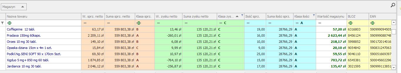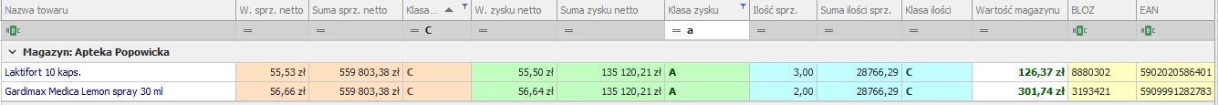 Za pomocą raportu jesteśmy w stanie wychwycić te pozycje na stanie apteki, które przynoszą bardzo mało zysku – grupa zysku C, a jest ich dużo na stanie – grupa Ilości A, jak na przykładzie poniżej: