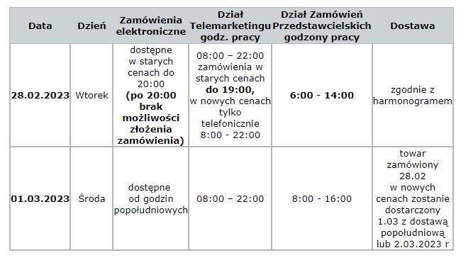Od godziny 20:00 dnia 28 lutego (WTOREK) nie będzie możliwości składania zamówień w formie elektronicznej, czyli również zamówień wysyłanych na konto FTP.