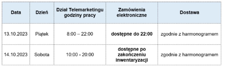 od godz. 22.00, do soboty- do zakończenia prac inwentaryzacyjnych nie będzie można drogą elektroniczną składać zamówień ani pobierać faktur.