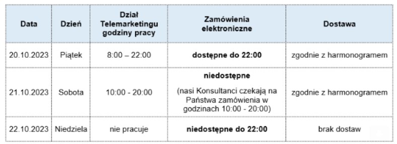 od godz. 22.00, do niedzieli 22 października do godziny 22:00 nie będzie można drogą elektroniczną składać zamówień ani pobierać faktur.