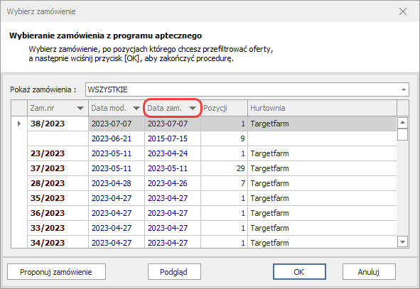 W oknie wyboru zamówienia z programu aptecznego (przy jego wczytywaniu do bufora zamówienia w Sertum) dodaliśmy informację o dacie zamówienia.