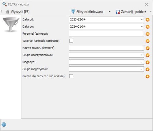 Jeżeli w filtrach zaznaczymy checbox – Premia dla ceny ref. lub wyższej, to raport policzy nam premię tylko do tych sprzedaży, w których miała miejsce sprzedaż w cenie referencyjnej lub wyższej. Natomiast jeżeli nie zaznaczymy tej opcji w filtrach, raport naliczać będzie premie tylko dla sprzedaży, które nastąpiły po cenie równej cenie referencyjnej.