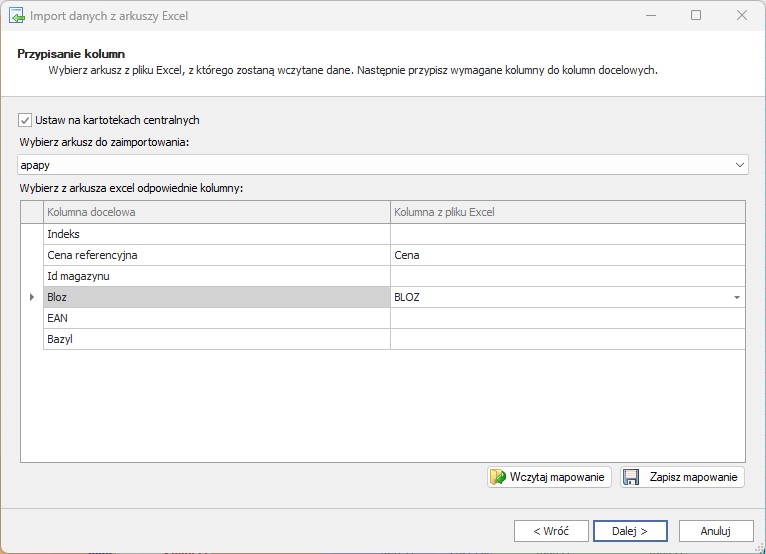 W kolejnym kroku należy wskazać arkusz, z którego będziemy importować ceny oraz wskazać kolumny.