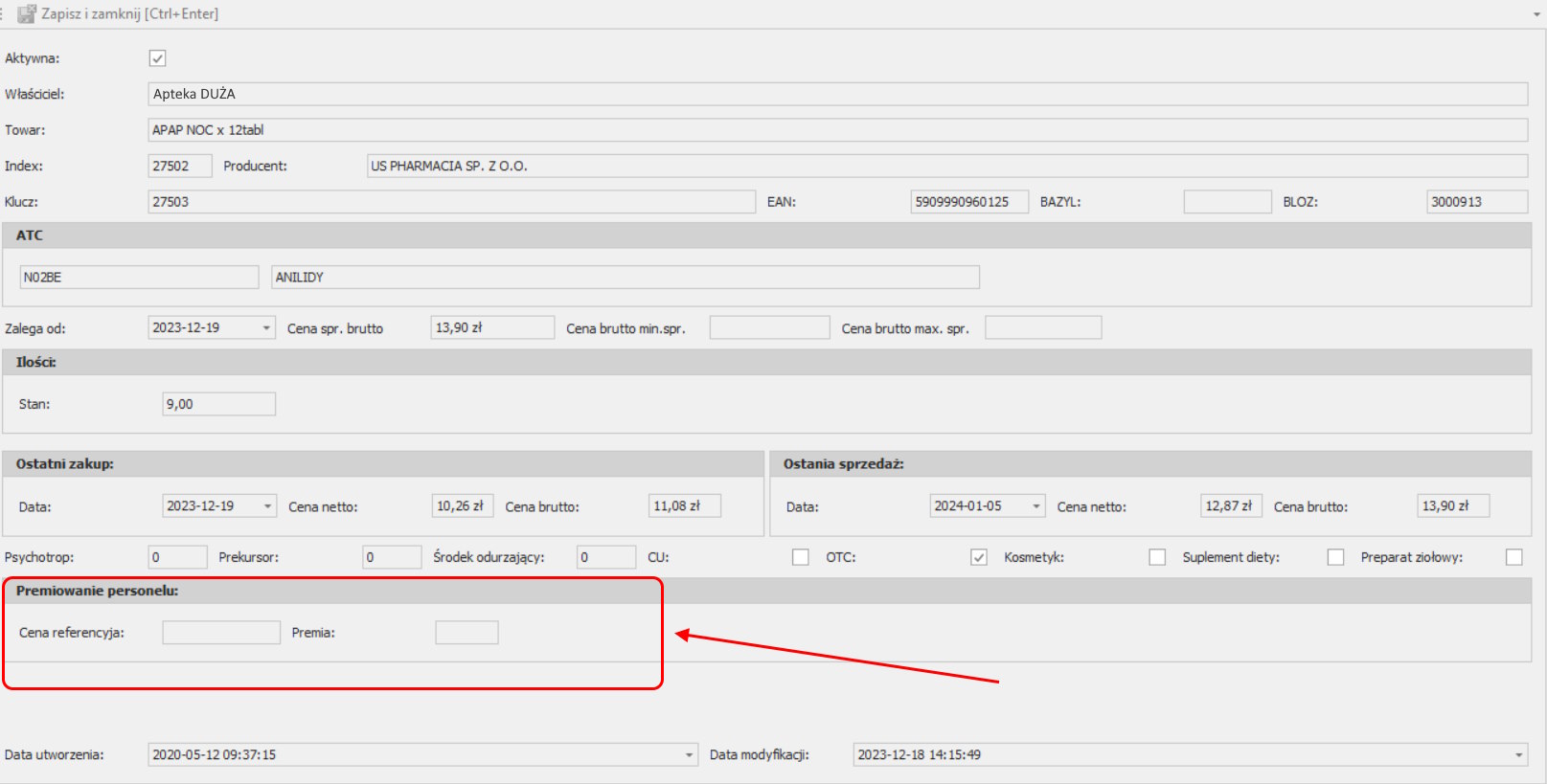 Cenę referencyjną i premię ustawioną na kartotece centralnej można również sprawdzić. Wystarczy wejść w Edycję kartoteki centralnej np. w widoku dostępnym w module Magazyn – widok Kartoteki centralne – Edytuj (okno Kartoteka Centralna->widok Nagłówek) i spojrzeć na ostatnią sekcje.