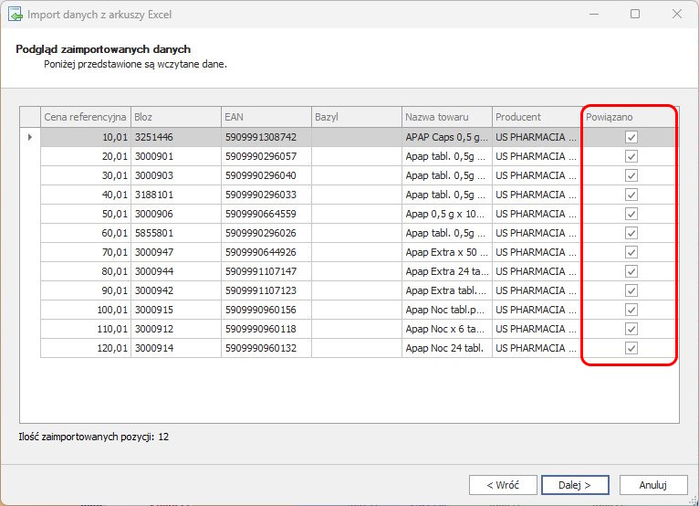 Po prawidłowym wskazaniu kolumn klikamy przycisk Dalej. Otworzy się wtedy Podgląd zaimportowanych danych.