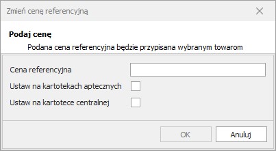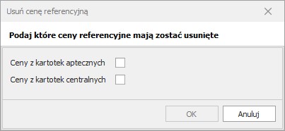 – operacja pozwala na usunięcie wcześniej zapisanej ceny referencyjnej. Tak samo jak w przypadku dodania ceny referencyjnej, cenę możemy usunąć z kartoteki aptecznej lub kartoteki centralnej.