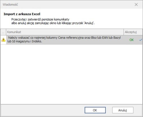 Jeżeli w pobranym raporcie, znajdują się jakieś pozycje bez ceny referencyjnej, to zostaniemy o tym poinformowani za pomocą komunikatu: