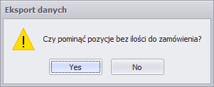 Jeżeli wybierzemy przycisk Yes, w pliku Excel nie pojawią się preparaty, dla których komórka zawierająca Ilość do zamówienia jest pusta. Przy wybraniu No, pozycje z pustymi ilościami zostaną umieszczone w pliku.