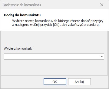 Po zaznaczeniu pozycji towarowej i kliknięciu operacji Dodaj do komunikatu otwiera się okno, w którym należy wpisać tytuł nowego komunikatu – np. „apap noc” lub wybrać z listy już istniejących komunikatów.