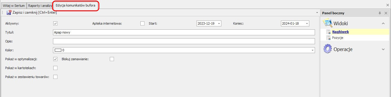 pozwalająca na przekazanie informacji dotyczących towarów w ramach sieci aptek lub pojedynczej apteki. W ten sposób mogą być przekazywane ważne informacje czy ostrzeżenia, które będą przez cały czas widoczne przy wybranych pozycjach w momencie, gdy te pozycje zostaną zoptymalizowane w buforze zamówienia lub wyświetlone w wybranych zestawieniach.