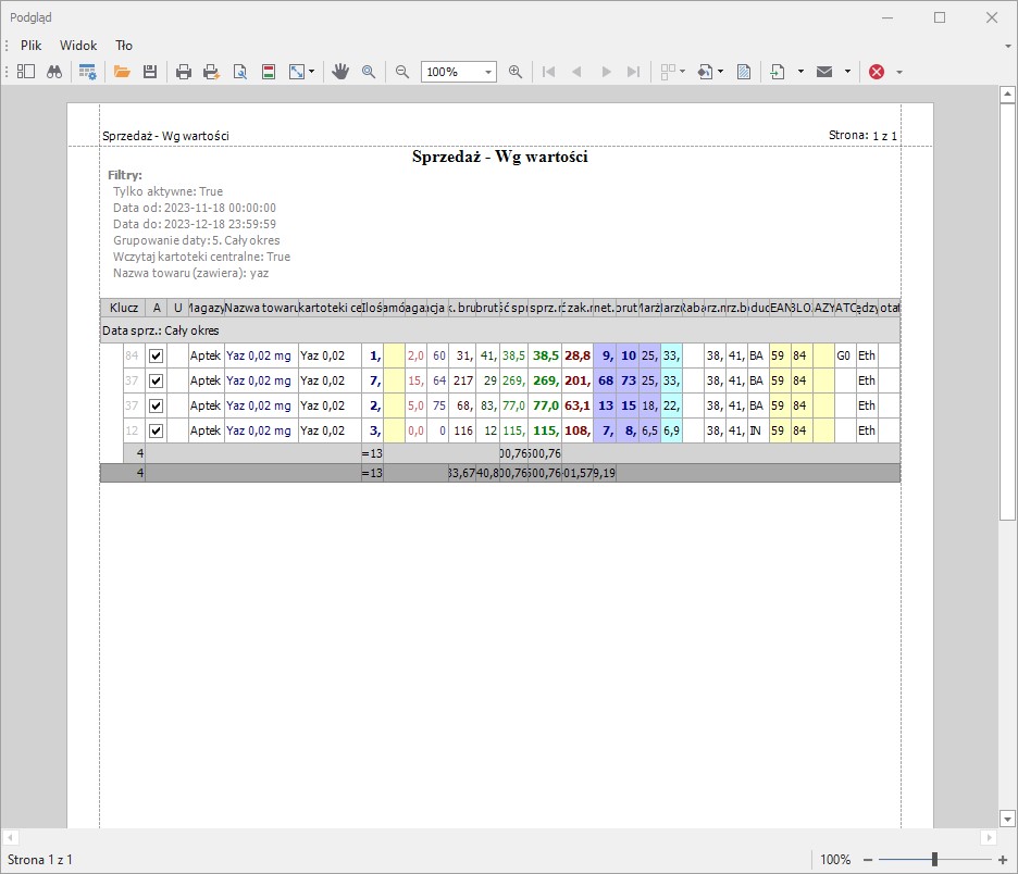 Sprzedaż wg wartości jest raportem najczęściej używanym przez menedżerów sieci aptek. Dzięki niemu w szybki i prosty sposób jesteśmy w stanie przygotować zamówienie przedstawicielskie z rozbiciem na poszczególne apteki sieci. Poniższy wpis zawierać będzie szczegółowy opis dostępnych w raporcie funkcji i operacji.
