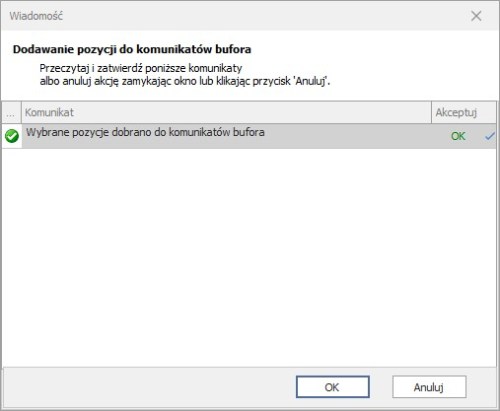 W przypadku dodania towaru do już istniejącego komunikatu, po przyciśnięciu przycisku OK zostanie wyświetlone okno z informacją: