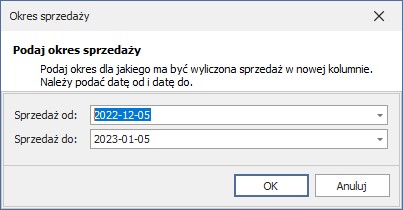 Po użyciu operacji do raportu zostanie dodana kolumna z ilością sprzedaży, w podanym okresie, dla towarów znajdujących się na widoku.