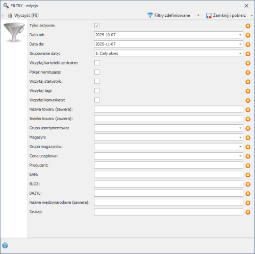 Aby pobrać dane należy w pierwszej kolejności kliknąć operacje Filtry [Ctrl+F] i uzupełnić wybrane pola:
