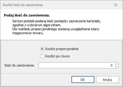 W raporcie uzupełni się kolumna Zamów. Kolumna zostanie obliczona na podstawie aktualnego stanu magazynowego oraz prognozy sprzedaży. Dla każdej apteki zostanie zaproponowana do zamówienia taka ilość towaru, aby wystarczył na taki sam okres sprzedaży, a suma zamówionych ilości będzie równa podanej w oknie ilości do rozłożenia.