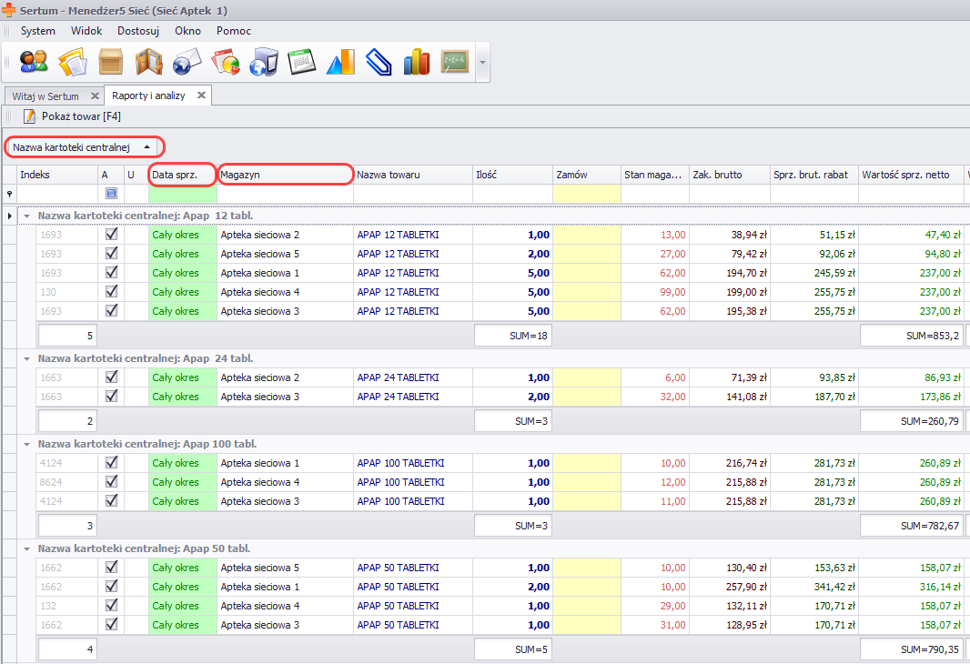 Z poziomu raportu w łatwy sposób można wykonać szybkie przesunięcie między aptekami w sieci.