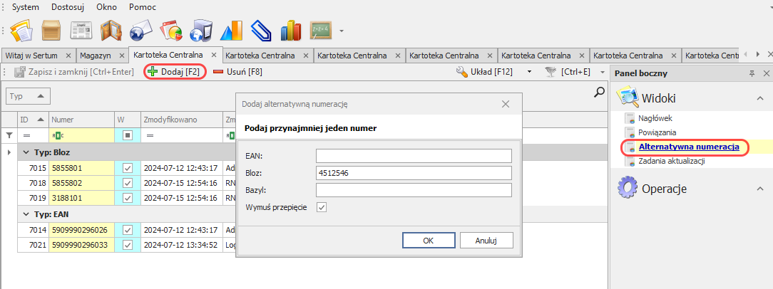 Numery alternatywne są wyświetlane w edycji kartoteki centralnej w widoku: