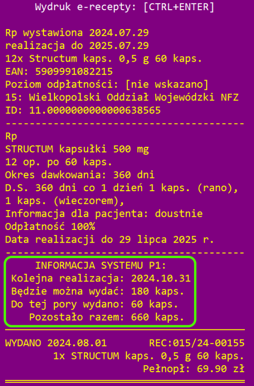 W przypadku recept rocznych z okresem dawkowania powyżej 120 dni, do podglądu dostępnego pod klawiszem F1 dodano informację o stanie realizacji recepty pozyskaną z Systemu P1.