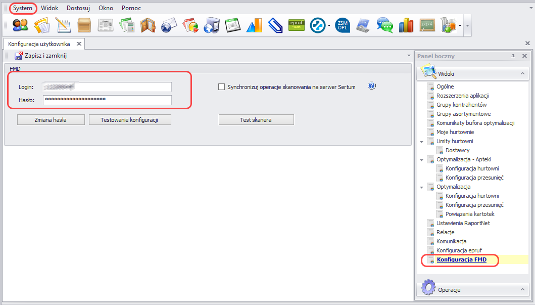 Aby skonfigurować w prawidłowy sposób aplikację należy wejść w System -> Konfiguracja -> Konfiguracja FMD i wypełnić pole Login oraz Hasło (są to dane, za pomocą których logują się Państwo do serwisu KOWAL) i sprawdzić poprawność połączenia za pomocą przycisku Testowanie konfiguracji. Po udanym połączeniu należy zapisać konfigurację za pomocą przycisku Zapisz i zamknij. Czynności należy przeprowadzić na wszystkich stanowiskach na których będzie uruchomiony moduł Sertum FMD.