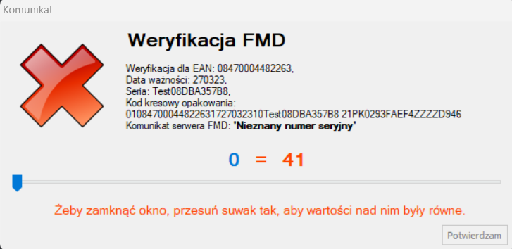 Jeżeli wynik weryfikacji lub wydania będzie negatywny, to w Sertum Apteka Malickiego wyświetli się dodatkowe okno, które można zamknąć po 7s poprzez przesunięcie suwaka i klikniecie Potwierdzam.