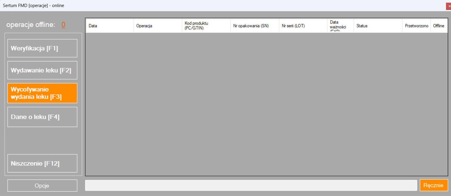 Aby wycofać lek oznaczony jako Wydany, należy otworzyć moduł FMD->wybrać Okno operacji. Następnie klikamy przycisk Wycofanie wydania i skanujemy opakowanie, które chcemy wycofać.