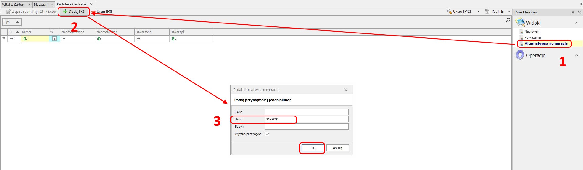 Po otworzeniu Kartoteki centralnej należy w kolejnym kroku otworzyć widok Alternatywna numeracja, a następnie przycisk Dodaj [F2]. Otworzy się wtedy okno o nazwie Dodaj alternatywną numerację.